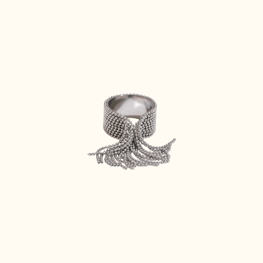 This ring features an elegant design with a stainless steel chain and tassel, enhanced with a protective coating for durability and shine. Its adjustable size ensures a comfortable fit for various finger sizes, making it a perfect addition to any jewelry collection. The superior craftsmanship guarantees long-lasting durability while adding a touch of sophisticated beauty.