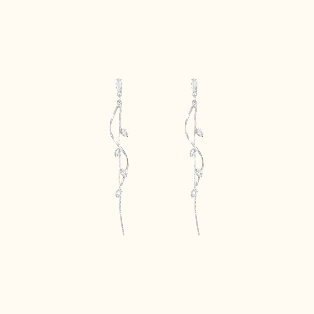 These chic silver color long drop earrings feature a vine design adorned with gleaming crystal leaf accents. Ideal for women's gala dinners, they combine elegance with sophistication, enhancing any formal attire while adding a touch of sparkle. Suitable for various occasions, they provide versatility in styling options.